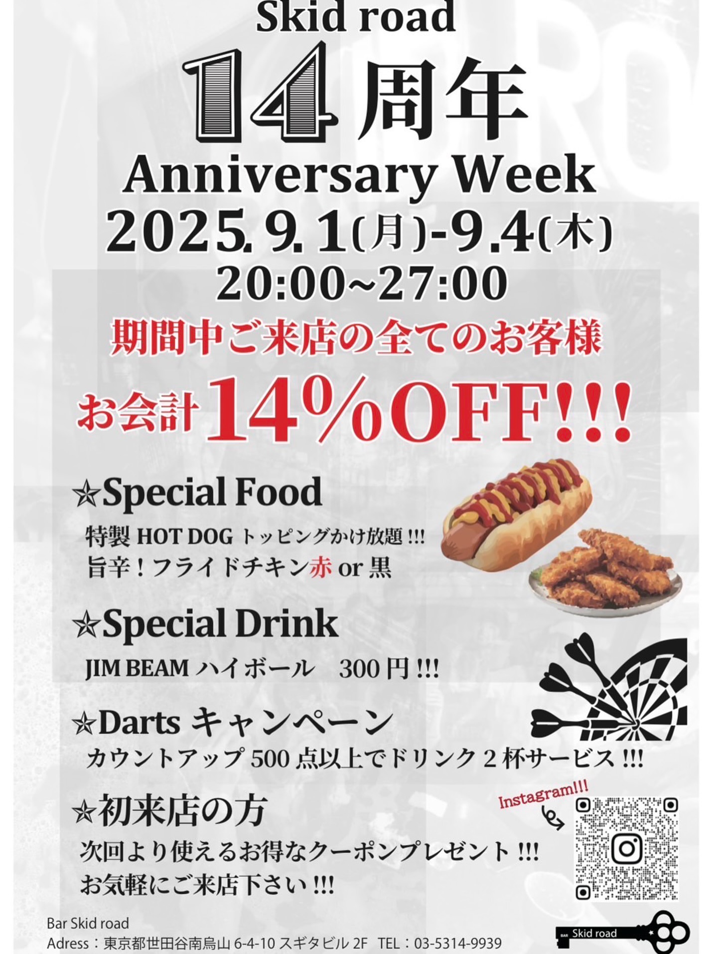 9/1(月)~9/4(木)にて、 Skidroad 14周年イベントを行います! なんとご来店のお客様、 全員お会計から14%OFF️ 他にも ・Special F...