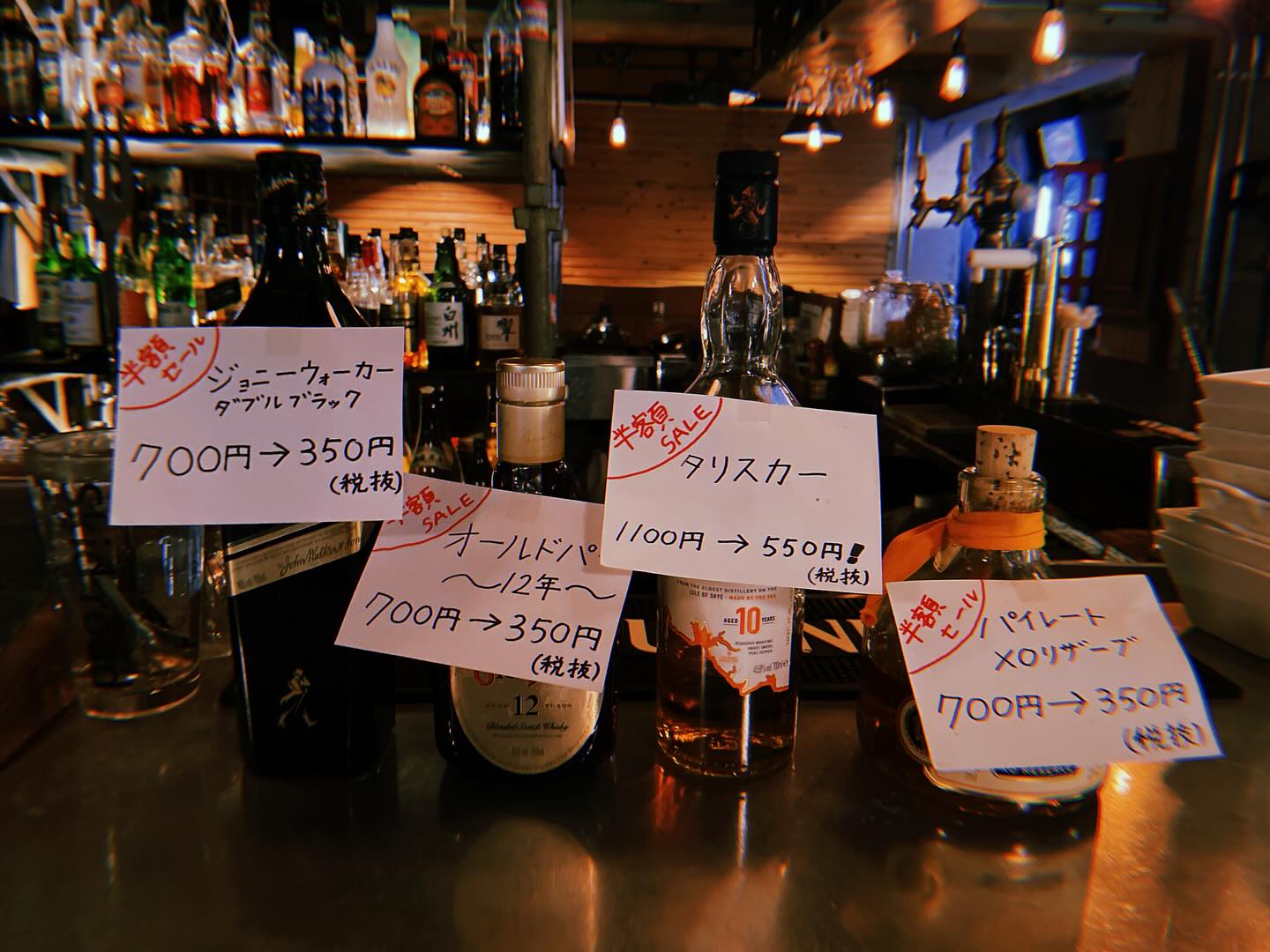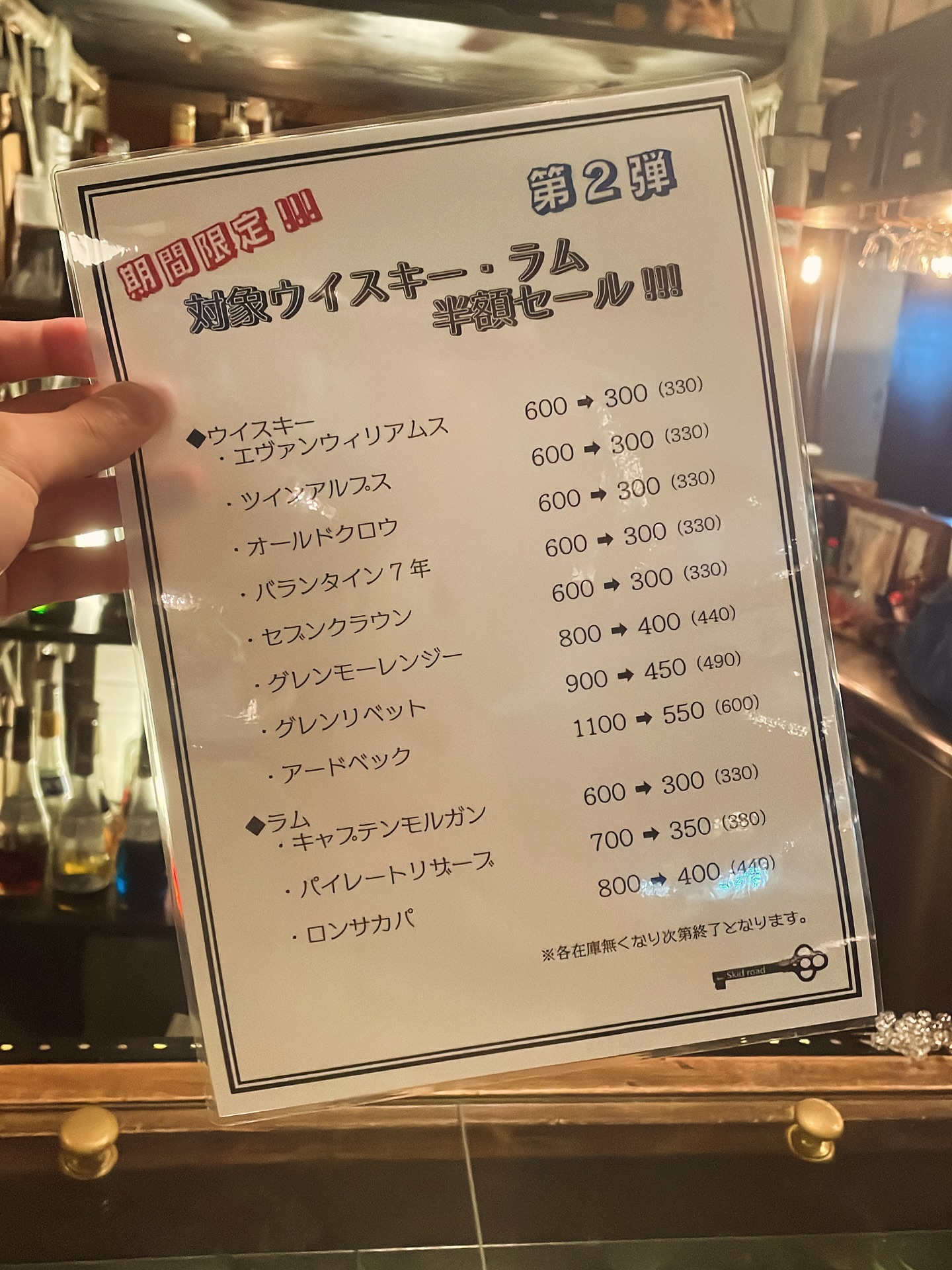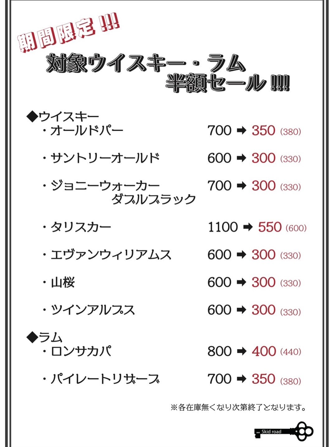 本日3時までの営業です! 本日から期間限定ウイスキー・ラム割引第2弾が始まります! 写真のメニューのウイスキー・ラムは全て半額セール...