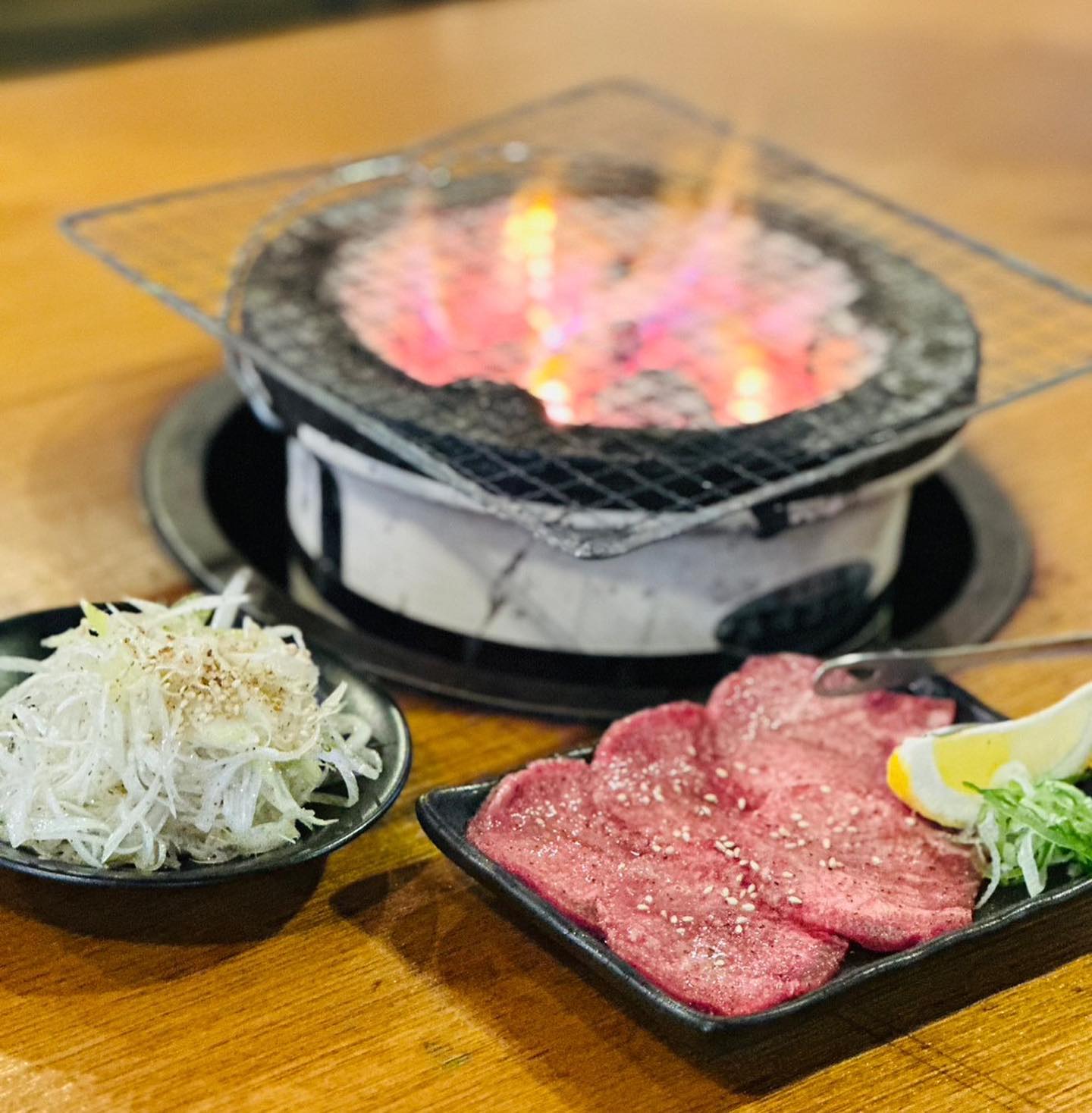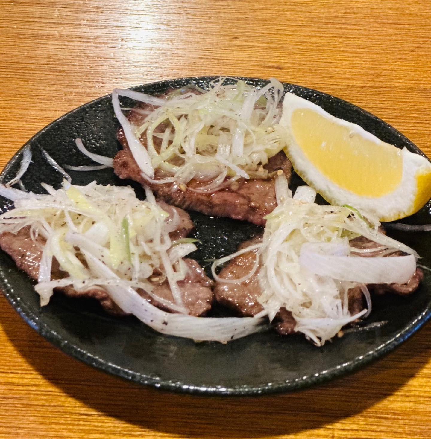 焼いた牛タンに味ネギ乗せてレモンをかけて堪能してください
