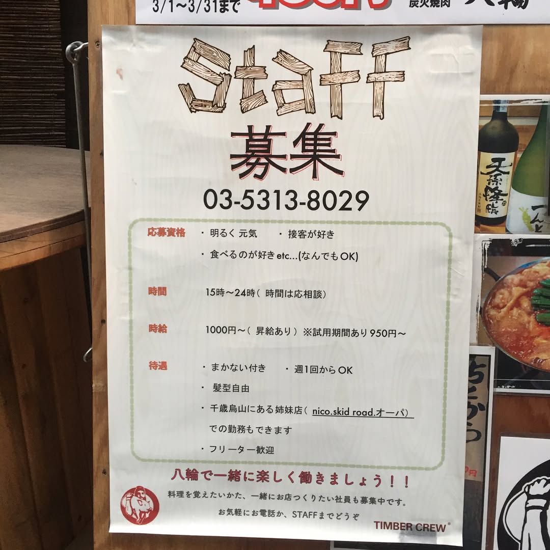 #八輪 #千歳烏山 #バイト #アルバイト #スタッフ #バイト募集 #アルバイト募集 #スタッフ募集 #まかない #髪型自由 #基本自由 #京王線 #烏山 #ちとから #ホルモン #もつ鍋 #激辛もつ鍋 #豚の看板 #路地裏 #うまい