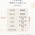 2024年12月28日 / 最終更新日 : 2025年11月6日 ハヤシヤ プレスリリース 【年末年始営業日のお知らせ】 【年末年始営業日のお知らせ】 ハヤシヤの年末年始は、 12/30〜31 通常営業(18時-24時) 1/1〜1/3 特別営業(15時-22時予定) 1/4〜5 お休み となります。 年末年始もたくさんのみなさまのご来店、 […]
