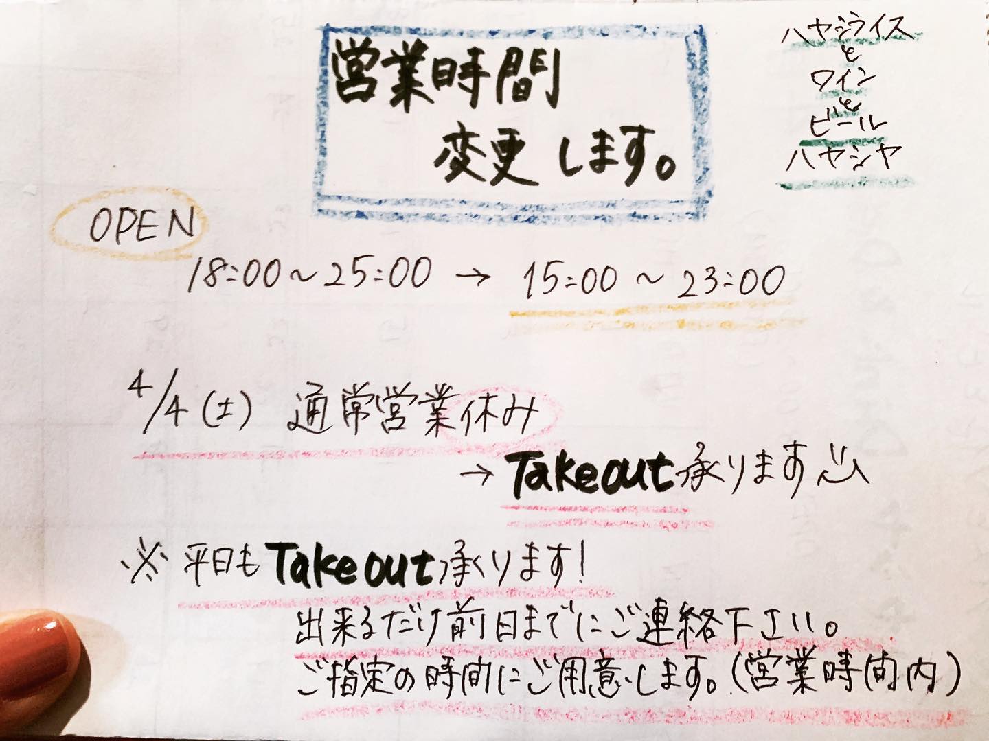 また、週末は営業を自粛し、4/4(土)はTakeoutのみの営業としますのでご了承下さい。