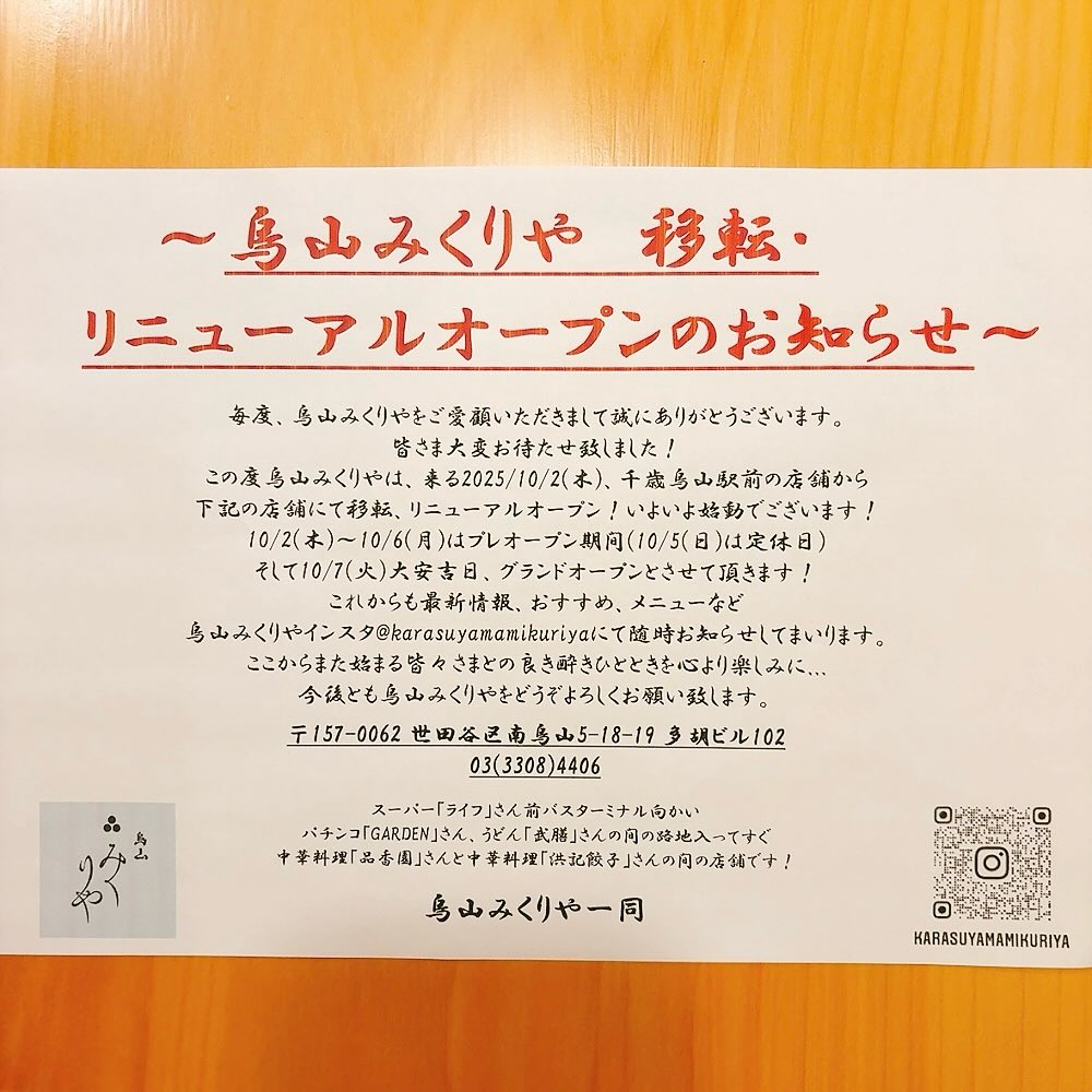 この度烏山みくりやは、2025/10/07(火)、同じ千歳烏山の南側にて移転オープン致します!