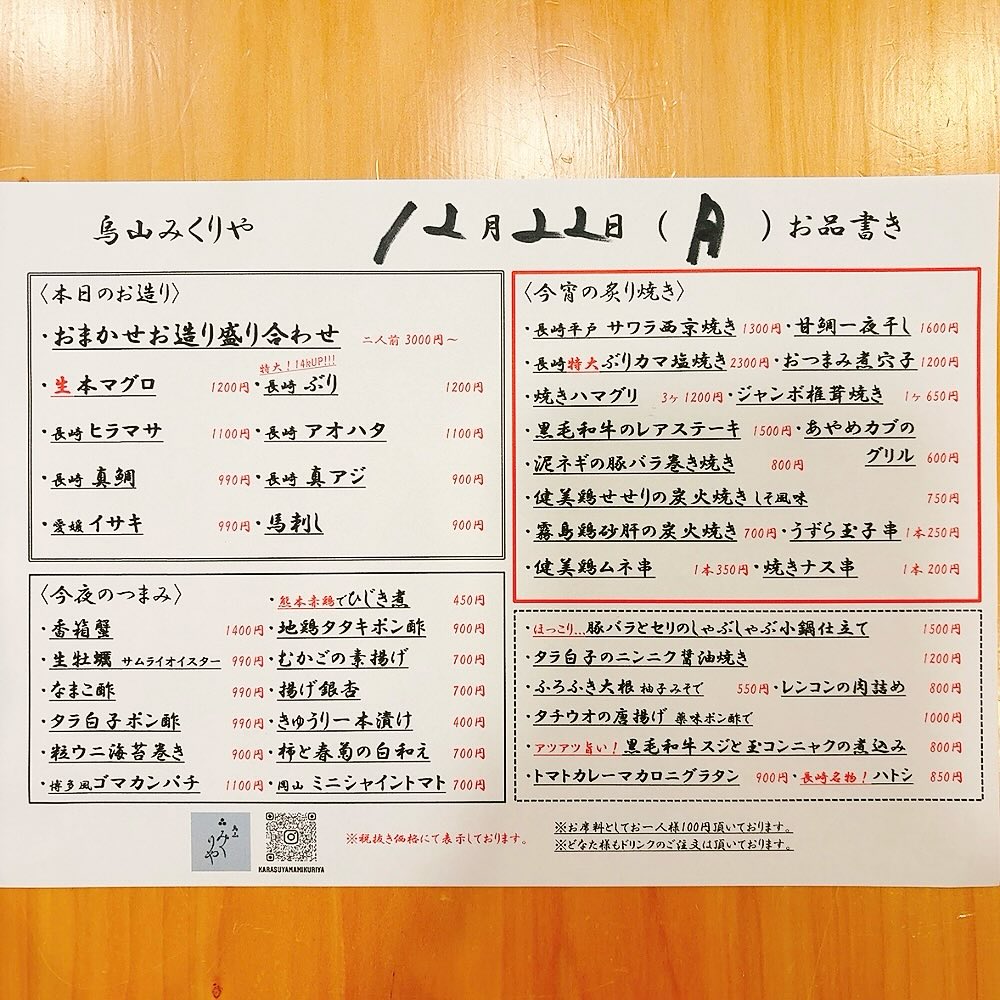 #烏山みくりや #みくりや #長崎 #平戸 #アジフライの聖地 #世田谷そだち #千歳烏山 #駅近 #京王線グルメ #京王線 #和食 #居酒屋 #日本酒 #ワイン #ケンゾーエステート #kenzoestate #menu #焼きハマグリ #ぶり #ふろふき大根 #自家製カラスミ #西京焼き #煮込み #炙り焼き #串焼き #平戸瀬戸市場 #世田谷ペイ使えます #ペイペイ使えます #スーパーコールド認定店 #年末年始カレンダー