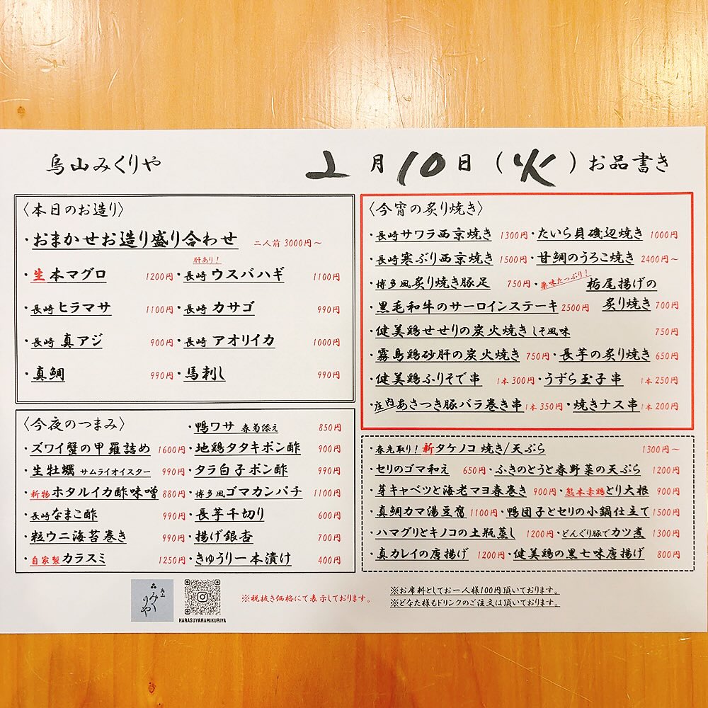明日2/11(水祝)ですか、烏山みくりやは臨時のお休みをいただきます!
