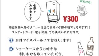 サカサにはお酒の自販機と大きなショーケースがあり、ショーケース内にあるグラスをお客様にセルフで取っていただき、自販機に現金300円をいれ、金宮焼酎またはウイスキーを買ってもらいます。