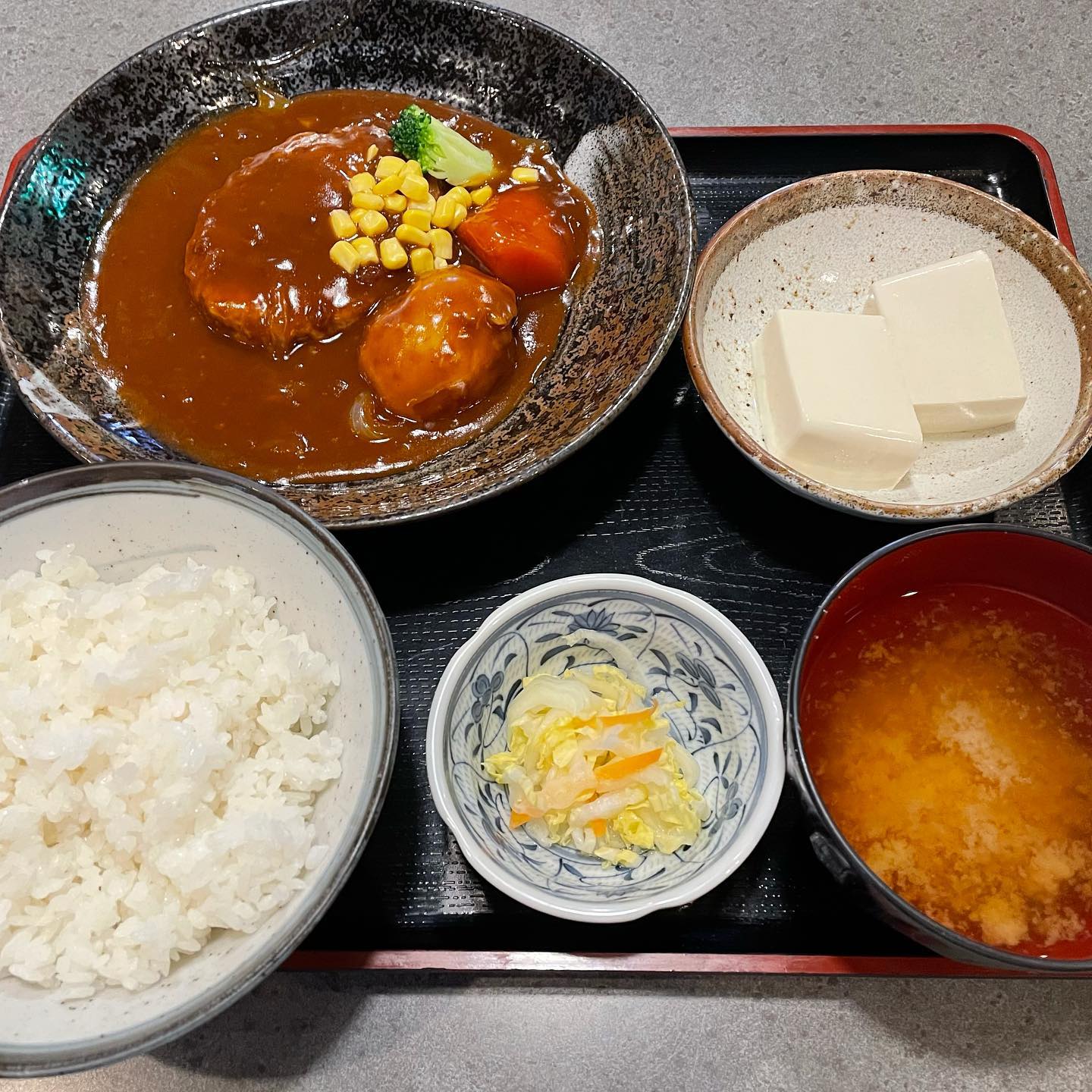 おはよーございます️今日も寒いですが頑張りましょう♪ 本日の日替わりランチです。 ハンバーグ煮込んじゃってます🍽