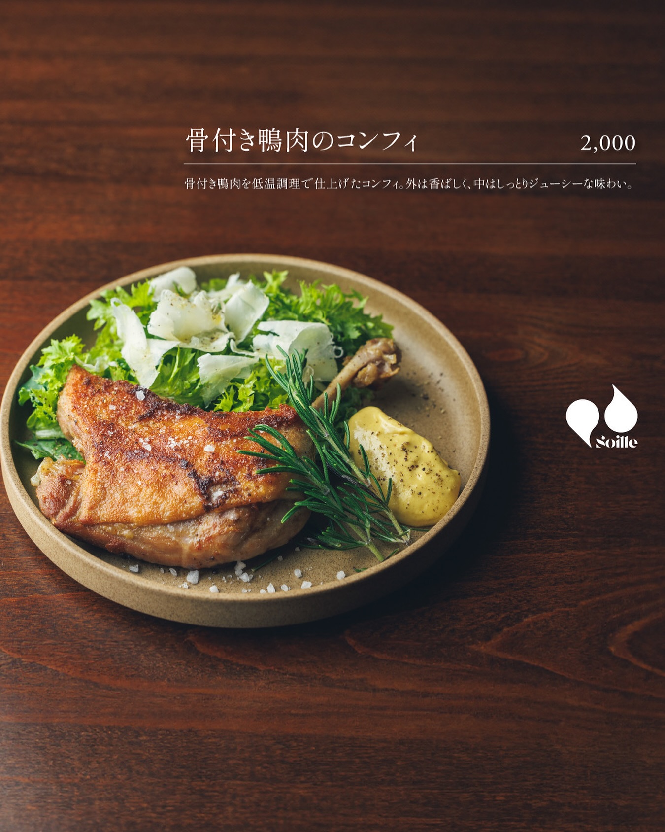 じっくりと低温調理された骨付き鴨肉は、ほろほろと柔らかく、外はカリッと香ばしい仕上がり。鴨肉本来の旨味を引き立てた贅沢な一品です。ランチプレートでもお楽しみいただけます。