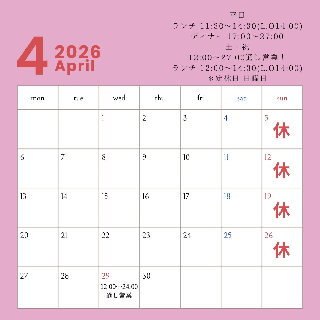 とか食堂の4月営業日!変わらず日曜日定休!